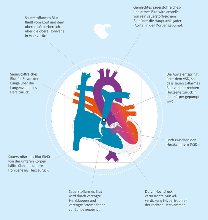 Sehr selten ist auch der Einsatz einer Gefäßprothese nötig, die die Lungenschlagaderund klappe ersetzt. Liegt eine ausgeprägte Unterentwicklung der Lungengefäße vor, kann in seltenen Fällen bei Neugeborenen ein sogenannter aorto-pulmonaler Shunt notwendig werden: Es wird eine Verbindung zwischen Körper- und Lungenschlagader geschaffen, die die Lungendurchblutung zunächst sicherstellt, bis die Lungengefäße groß genug für den vollständigen Eingriff erscheinen.